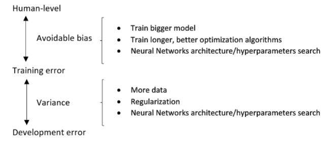 兩週份量,無程式作業,感覺是第二週講述調參數概念的延伸,如何從 train set, dev set, test set 的 error rate 判斷該如何繼續調整 model。