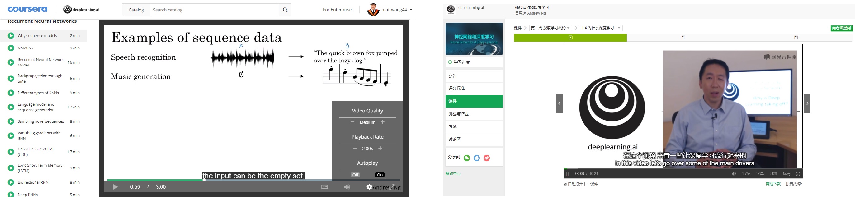 課程教材在Coursera 和中國網易雲課程 都有發布(可以同時使用),但我是在 Coursera 上完後才知道後者,如果不需要中文字幕的話用 Coursera 就夠了,以下依個人看法做點比較: