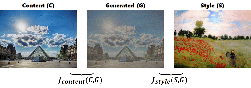 $$ J(G) = \alpha J_{content} + \beta J_{style} $$
