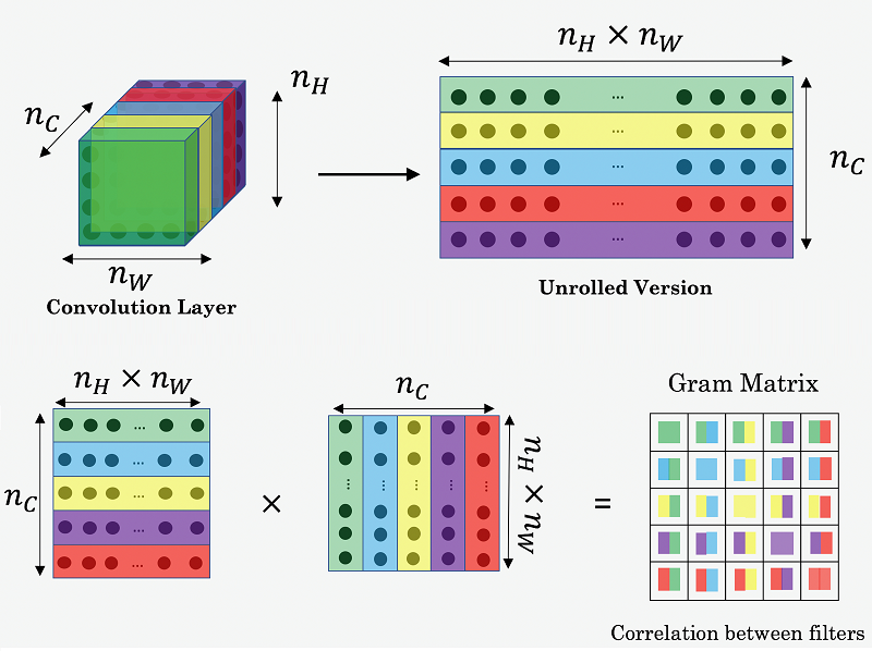 $$ g_{k,k’}^{[l] \left( G \right)} = \sum_{i=1}^{n_H^{[l]}} \sum_{j=1}^{n_W^{[l]}} a_{ijk}^{[l] \left( G \right)} a_{ijk’}^{[l] \left( G \right)} $$