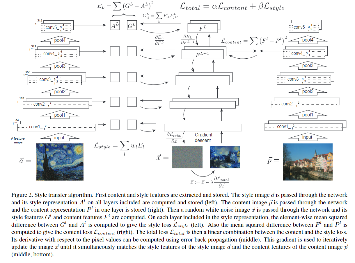 風格圖(S)和輸出圖(G)之間的 cost function 較為複雜,是一個特定數層捲積層activation 值的函數(原作使用 VGG19 的 conv1_1, conv2_1, conv3_1, conv4_1, conv5_1),目的是要得到 channels 之間的 correlation。