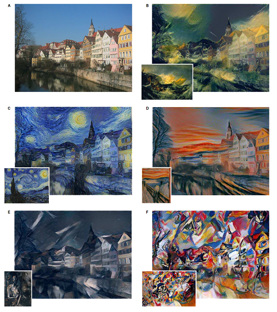 Neural Transfer 就是這種將畫作上的藝術風格移植到其他圖片上的技巧,而這周要介紹的論文實作便是這項技術的開山之作《A Neural Algorithm of Artistic Style 》(2015 年發布於 arXiv,2016 年發表於CVPR 上),作者為來自德國 University of Tübingen 的計算神經科學學者Leon A. Gatys , Alexander S. Ecker, Matthias Bethge ,他們嘗試用 CNN 來實現這一項過去被認為是專屬於人類的技能並獲得廣大迴響,三人也憑此技術創立一家公司 。