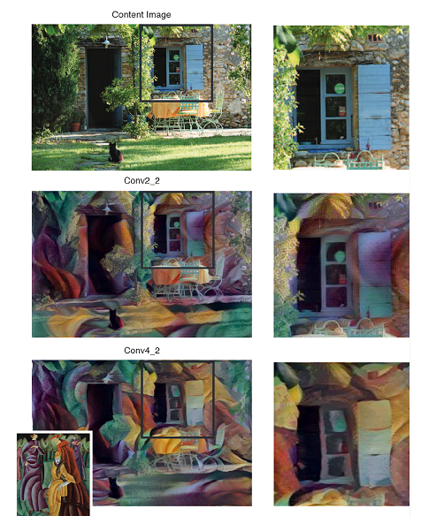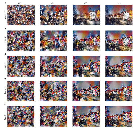 圖 9 右圖:橫軸為不同的 $\alpha / \beta$值,縱軸為 style cost function 涵蓋不同層數,row A 為只計算 conv1_1 一層、row B 為計算 conv1_1 和 conv2_1 兩層、row C 涵蓋三層…依此類推。可見$\alpha / \beta$越小則輸出圖(G)和內容圖(C)相去越遠而只含有風格特徵。而當 style cost function 只計算 conv1_1 一層則表現出較細微的風格特徵,計算涵蓋越深層則有較大的風格特徵。
